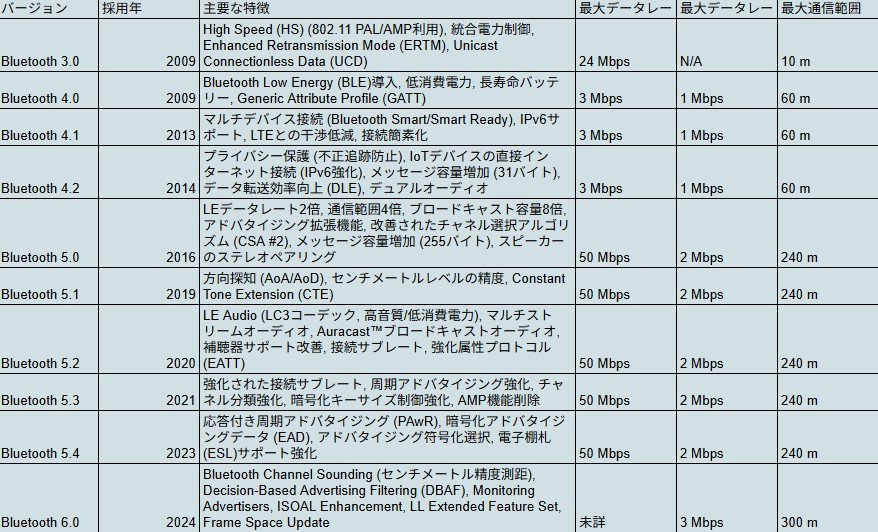 Bluetoothは年々規格が変わっているのでAIさんに書き出してもらった