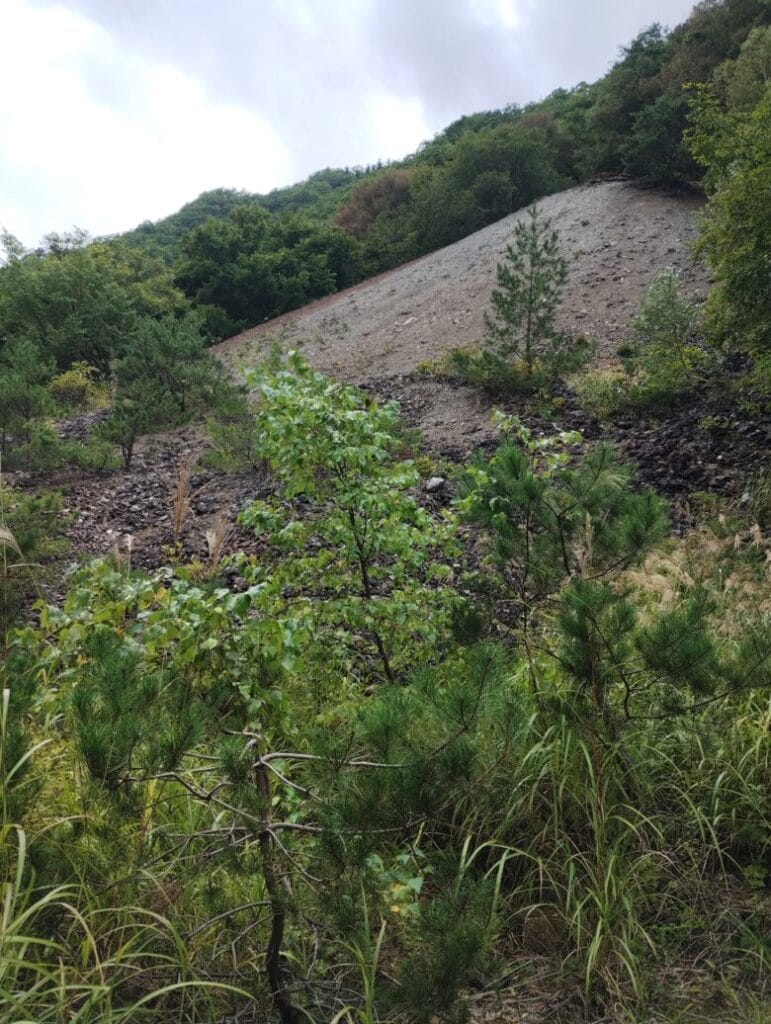 鉱山側は、草木が密生して土砂崩れのあともあり歩くのも一苦労