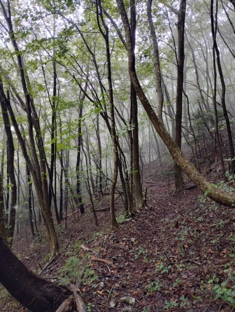 雨のせいもあり、水が流れ足場は崩れやすく四苦八苦して、なんとか林道に出る