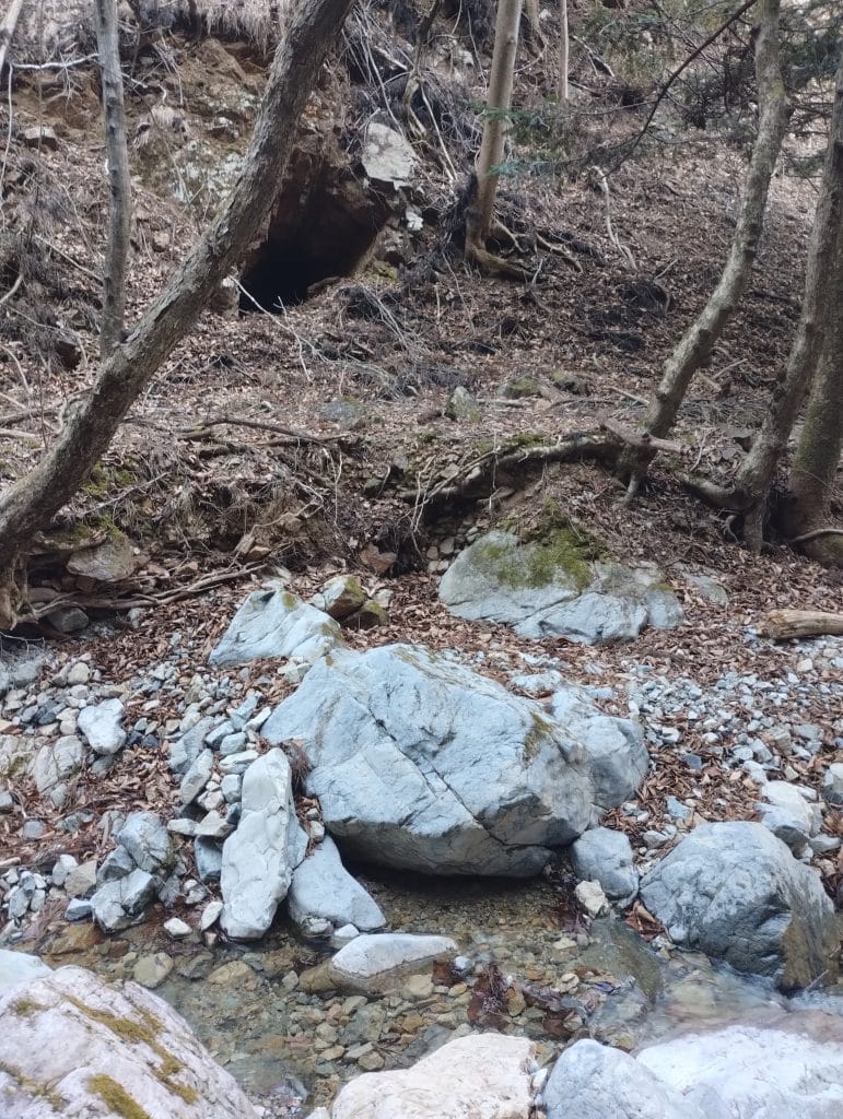 昼食を済ませて坑口跡近くまできて川沿いに進んでいた川を越えての探索